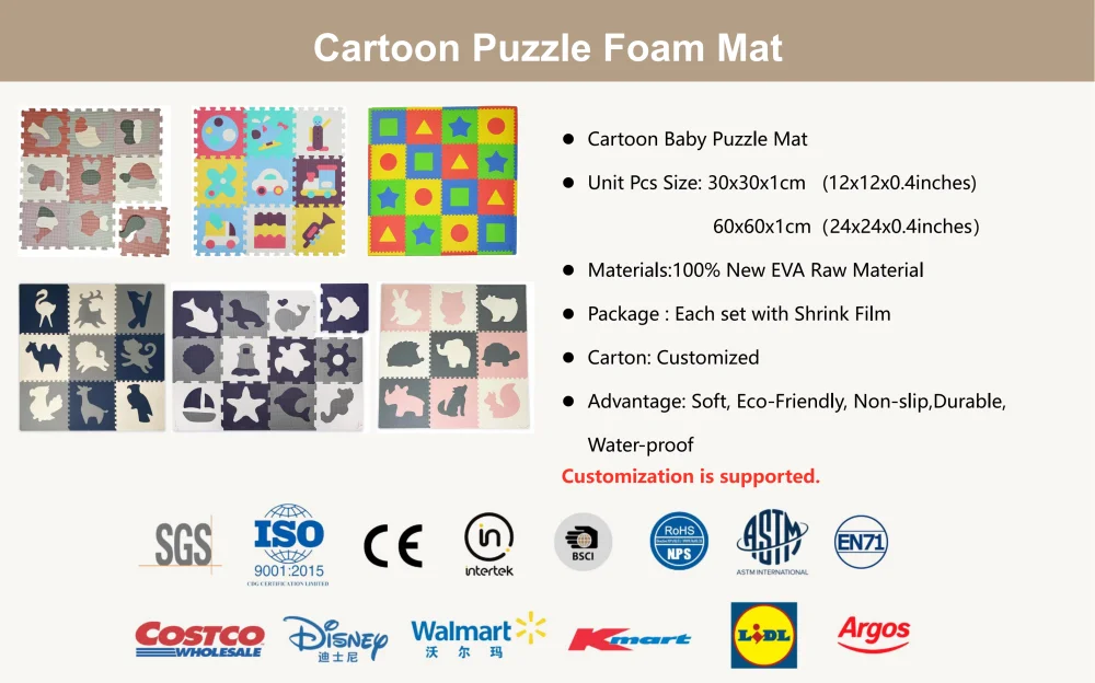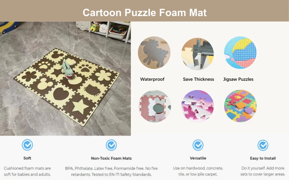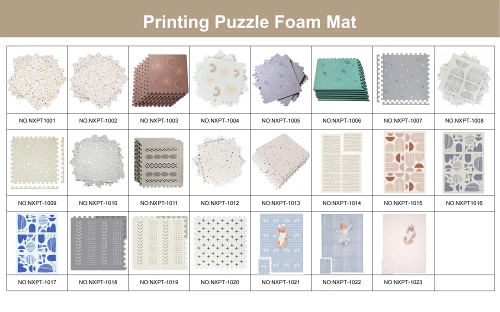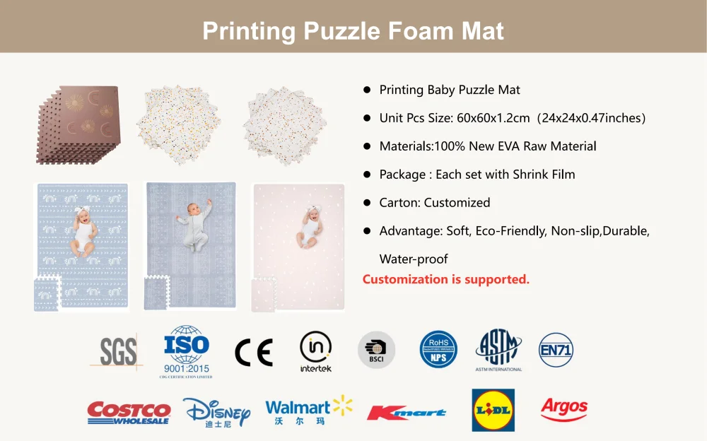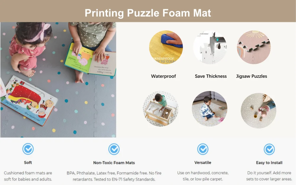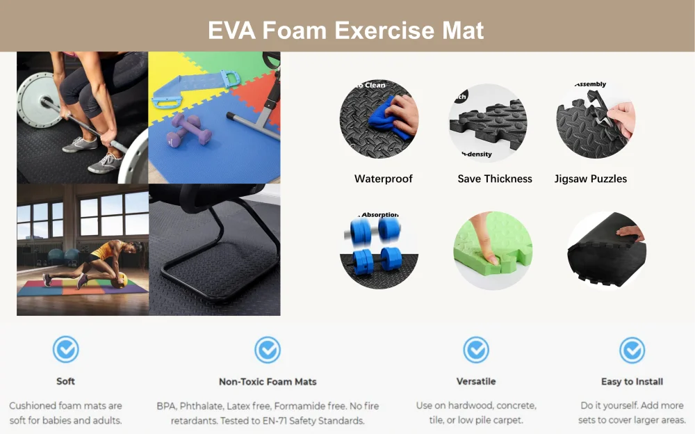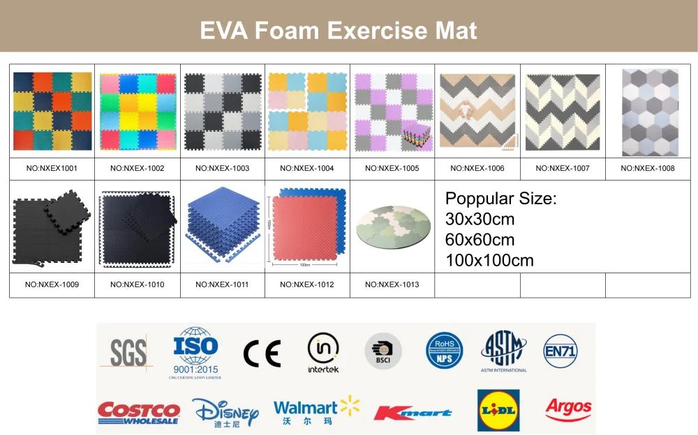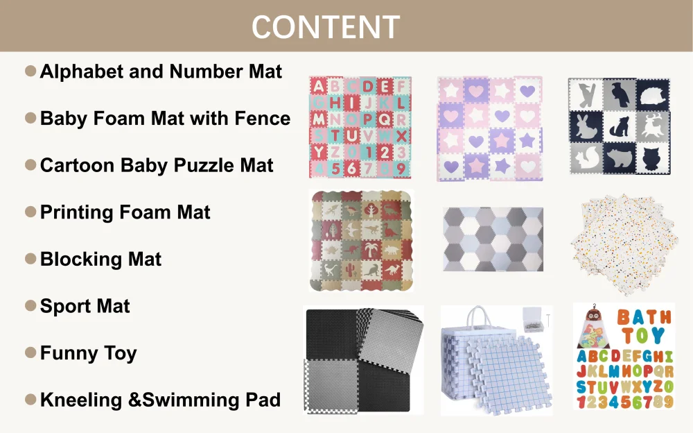 Productos principales:Estera de espuma EVA, estera de yoga EVA, estera de gateo de bebé EVE, estera de impresión EVA, estera de rompecabezas de bebé de espuma EVA