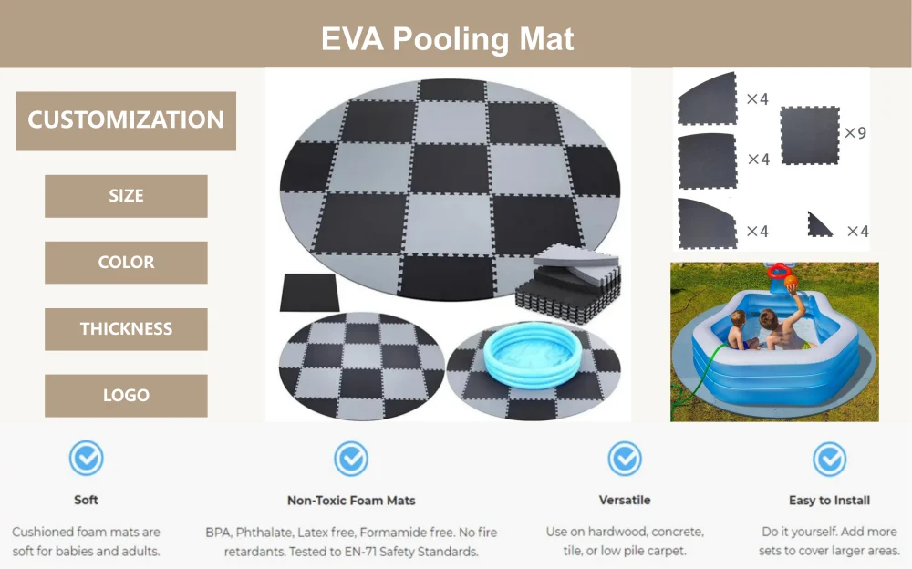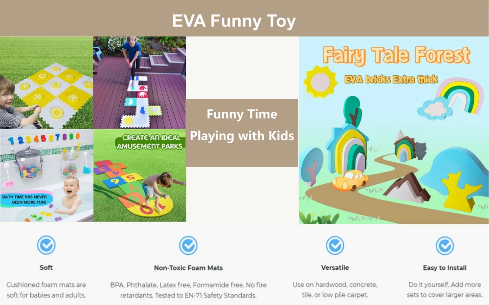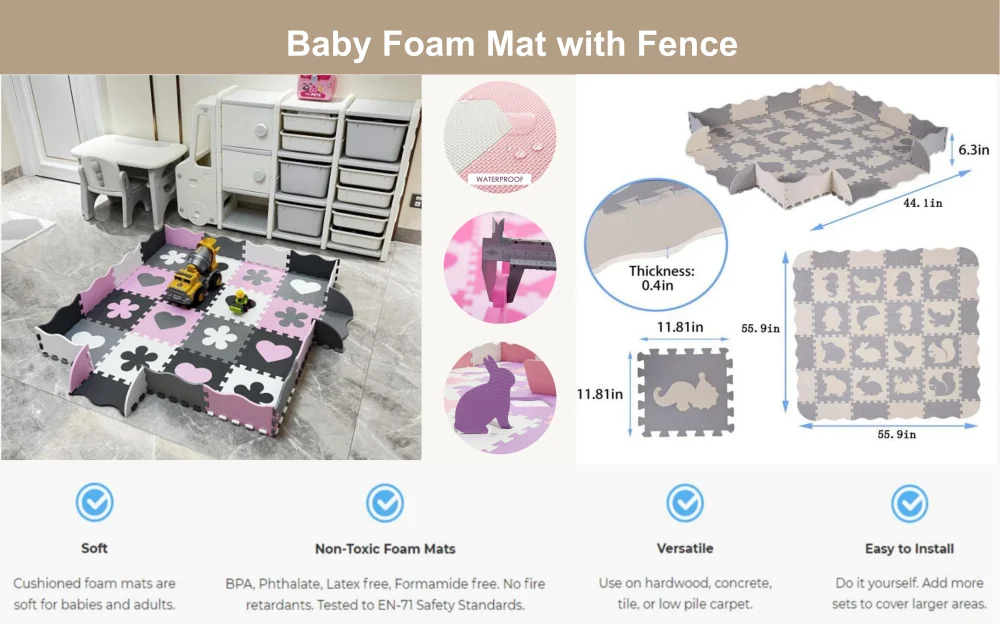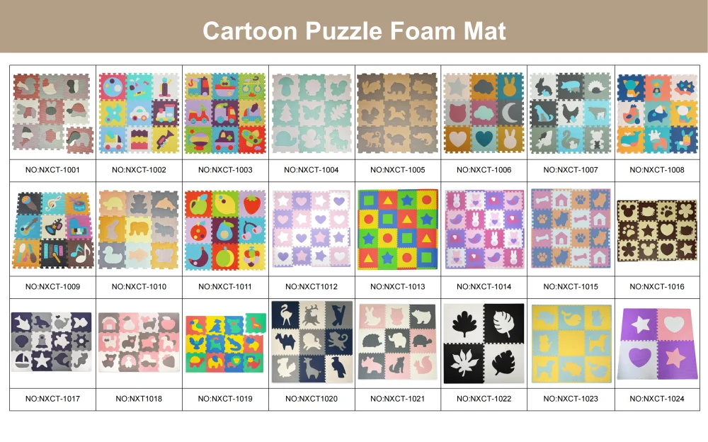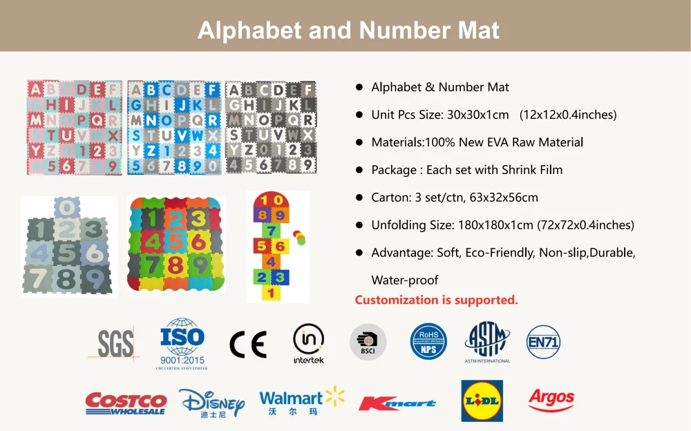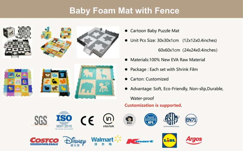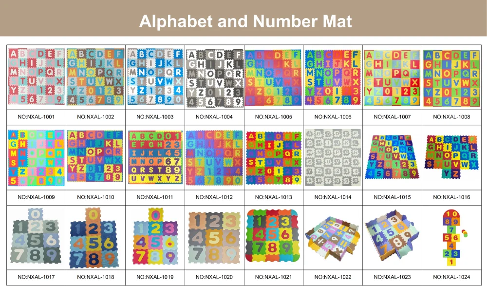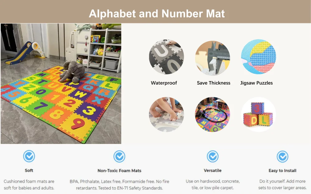 Productos principales:Estera de espuma EVA, estera de yoga EVA, estera de gateo de bebé EVE, estera de impresión EVA, estera de rompecabezas de bebé de espuma EVA